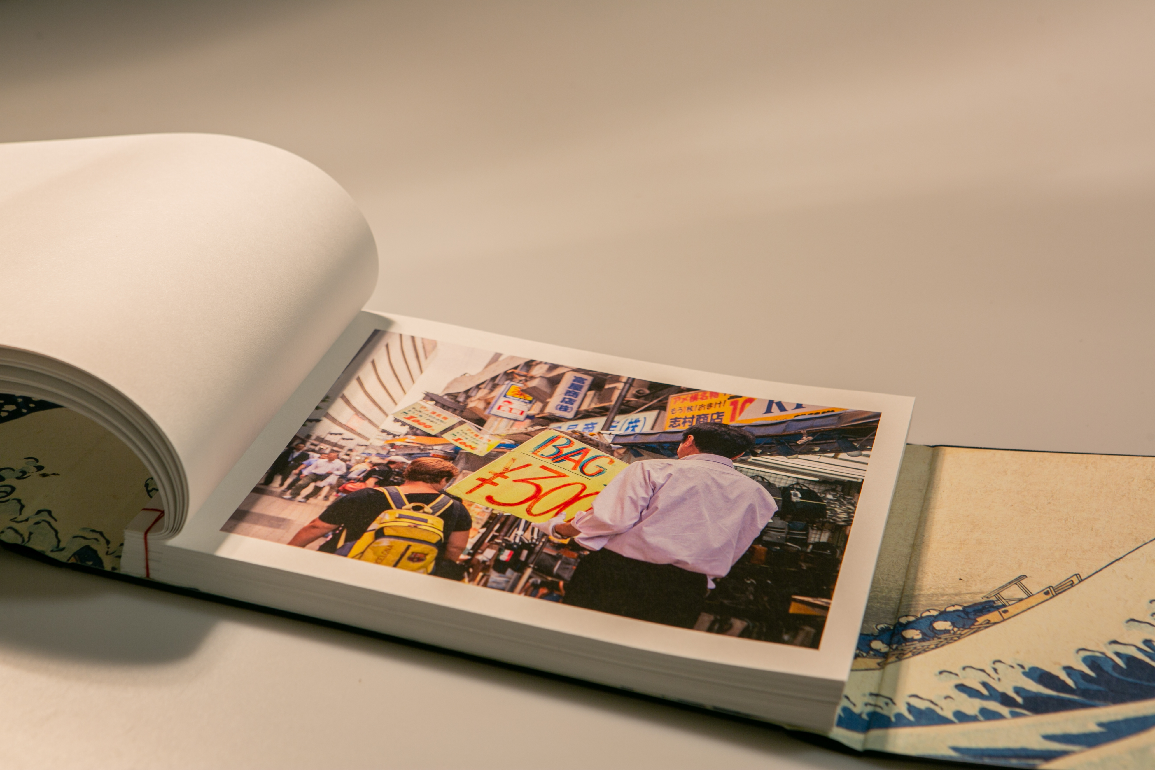 The book was originally made as a gift for a retiring teacher who shared my fascination for Japan. What began as a single copy eventually grew into a self-published edition of 30, each hand-bound using traditional Japanese binding. The book block sits loose inside a wrap-around cover. The title is debossed into the cover, tactile to the touch. Hidden magnets keep the wrap closed when the book is not in use.