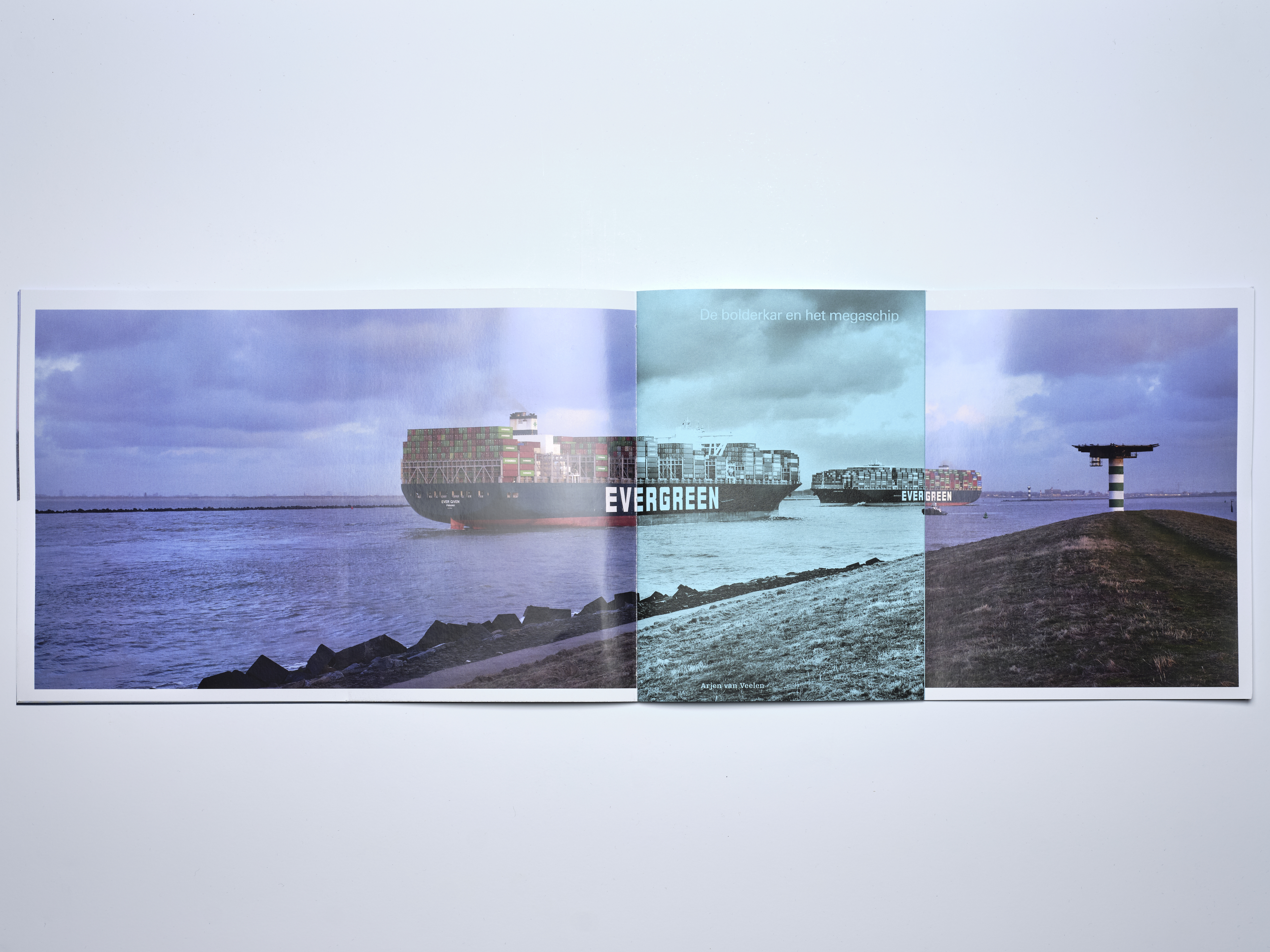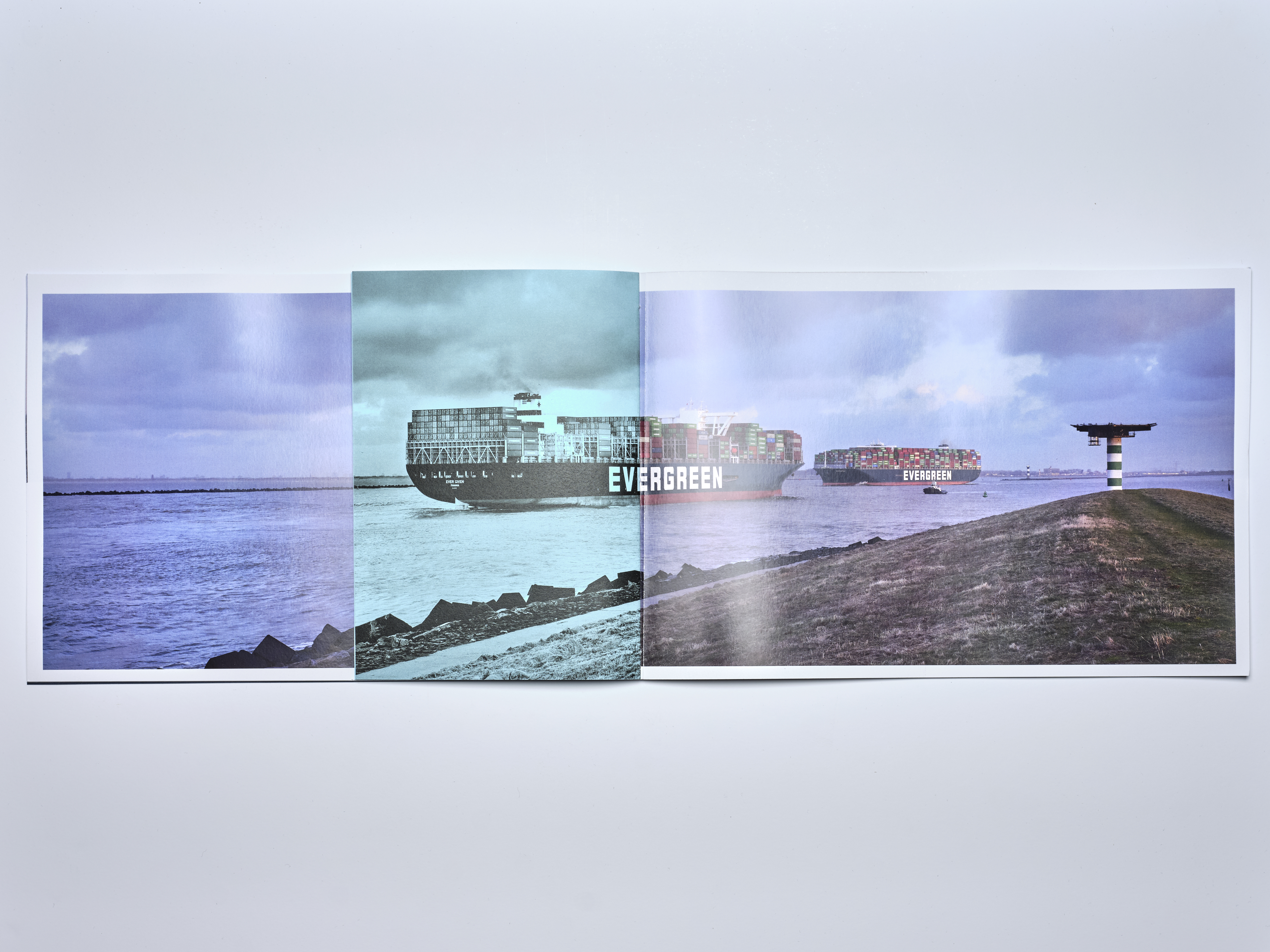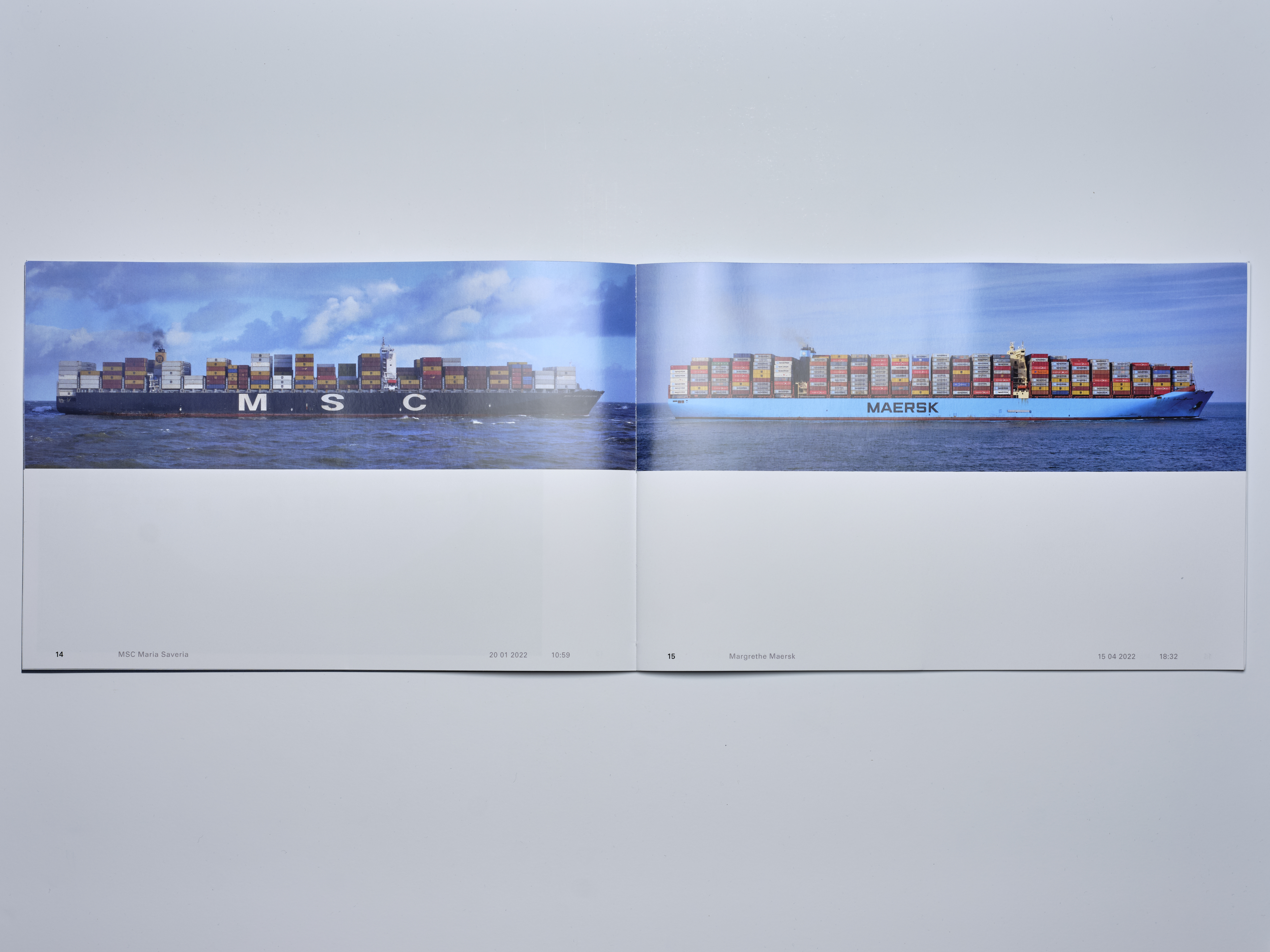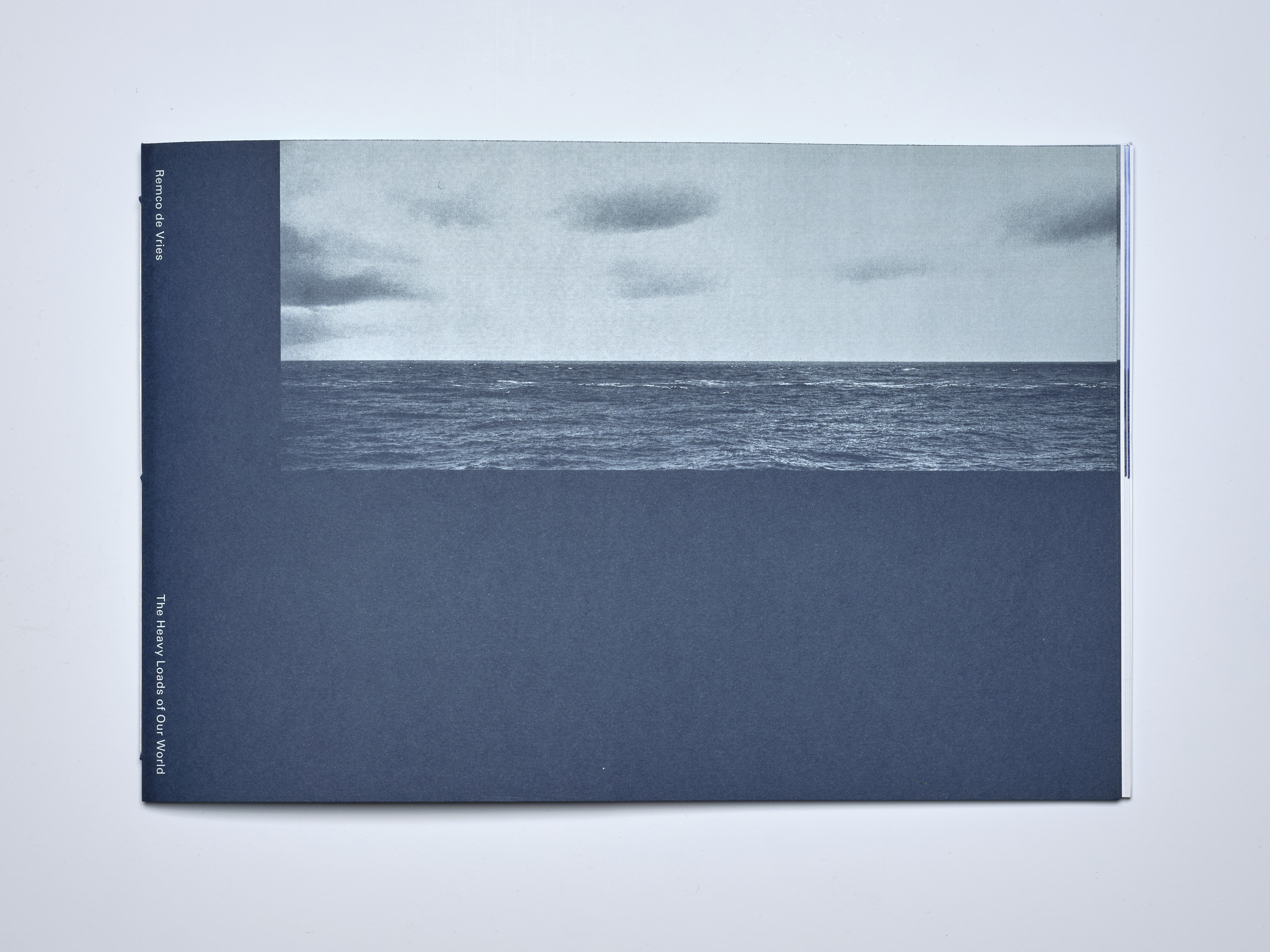 This publication, designed in collaboration with graphic designer Chris Boender, presents the 36 typological ship portraits at the heart of The Heavy Loads of Our World. The panoramic images fill the upper half of each spread, showing the vessels in strict side profile, sailing from left to right with consistent spacing around each ship. Because every photograph follows the same compositional logic, the horizon lines align across spreads. When the book lies open, the ships on the left and right pages appear to sail in convoy. Only the color of the sky or the roughness of the water reveals they are different photographs taken on different days.
